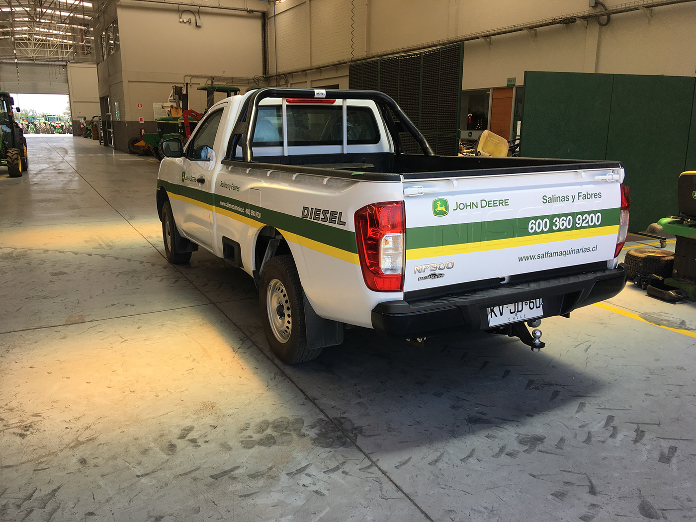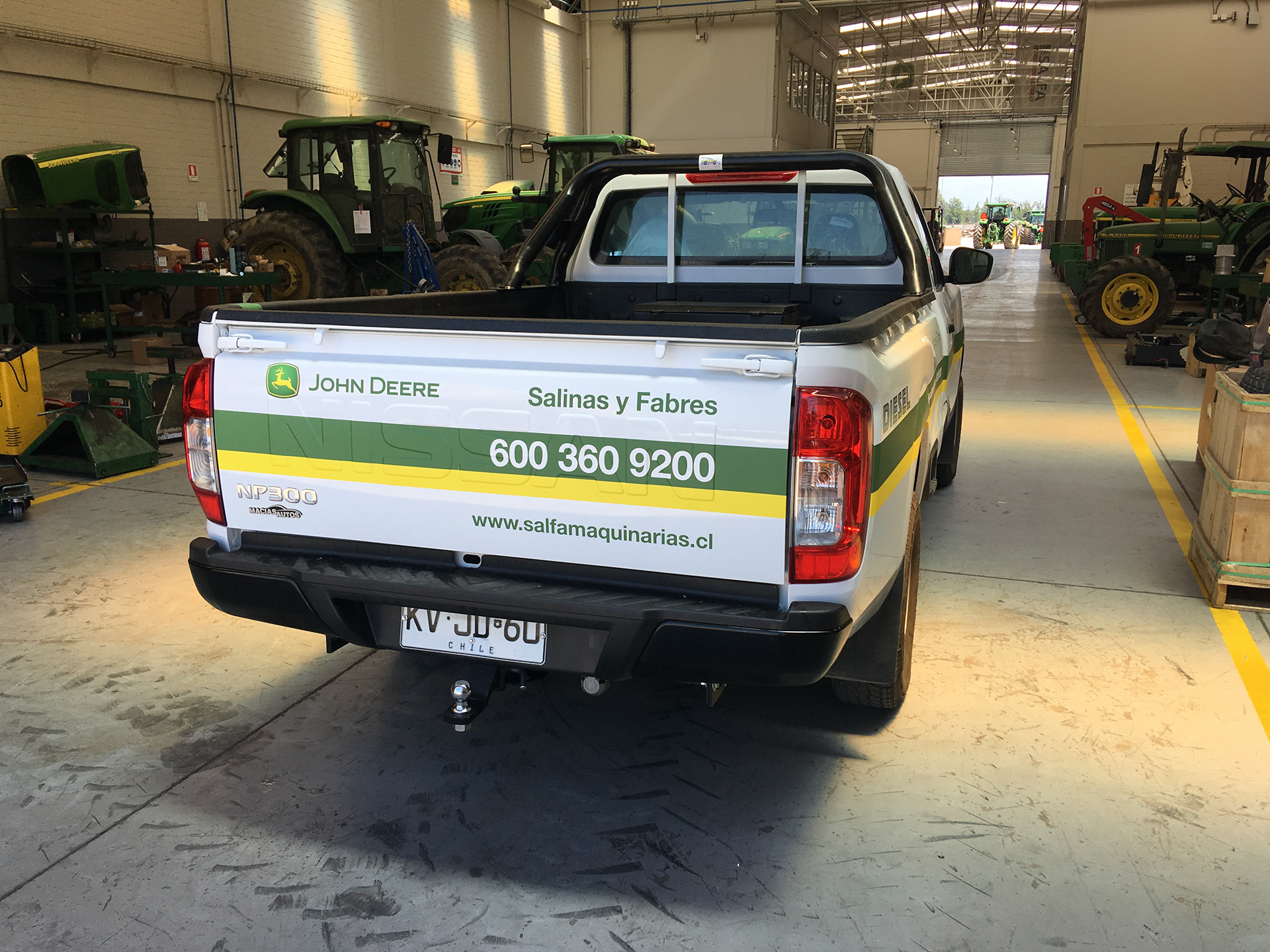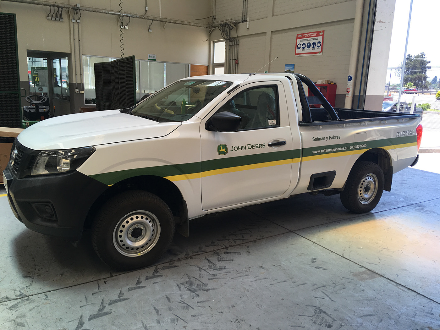Proyecto de instalación gráfica en oficinas de John Deere, enfocado en la renovación visual de camionetas corporativas.